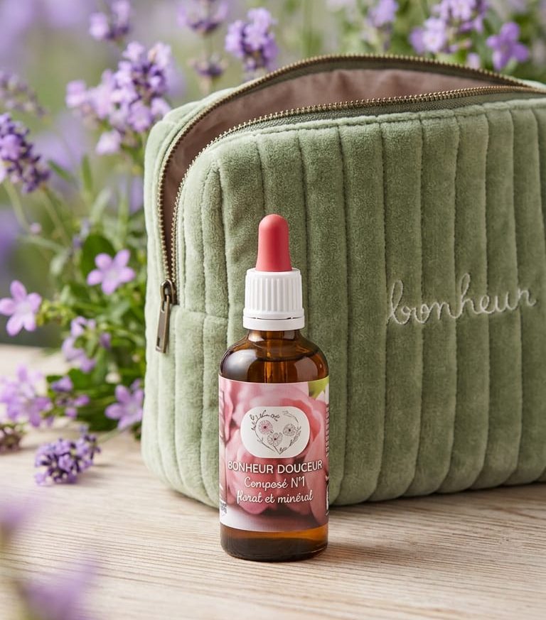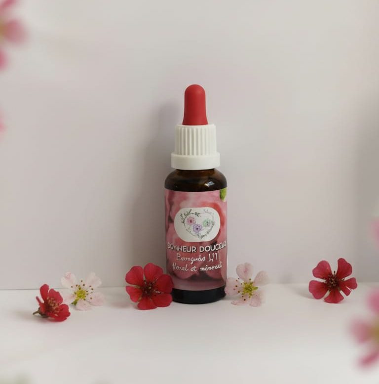 Elixir N°1 Bonheur Douceur. Un composé unique et complet élaboré par Fleurs en douceur, à base d’essences florales et d’eau de roche.