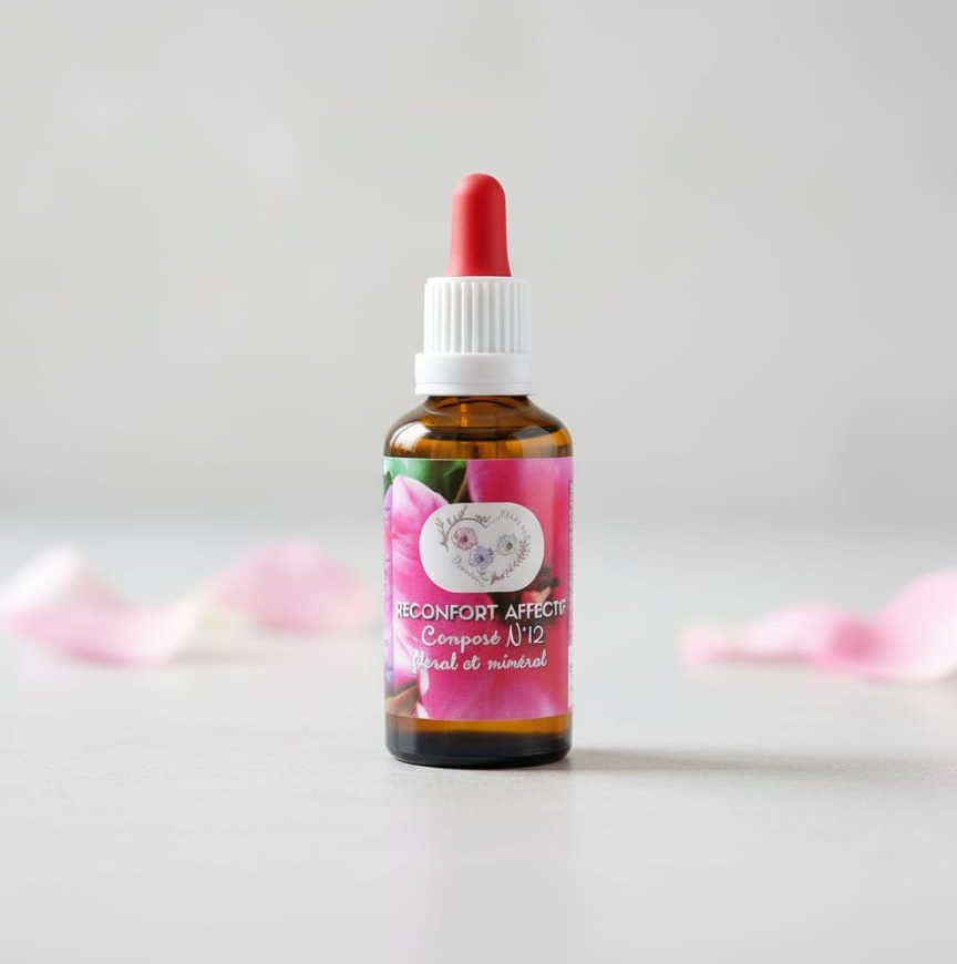 Elixir N°12 Réconfort affectif Un composé unique et complet élaboré par Fleurs en douceur, à base d’essences florales et d’eau de roche.
