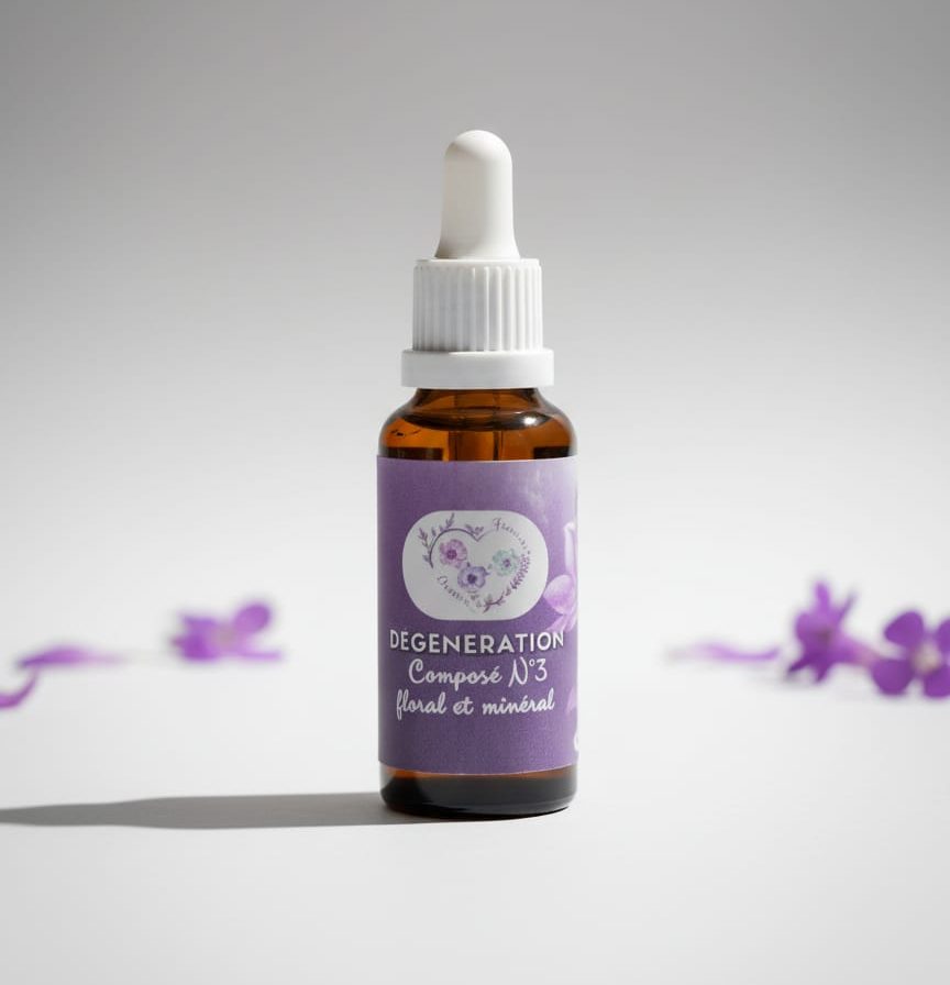 Elixir N°3 Regeneration. Un composé unique et complet élaboré par Fleurs en douceur, à base d’essences florales et d’eau de roche.